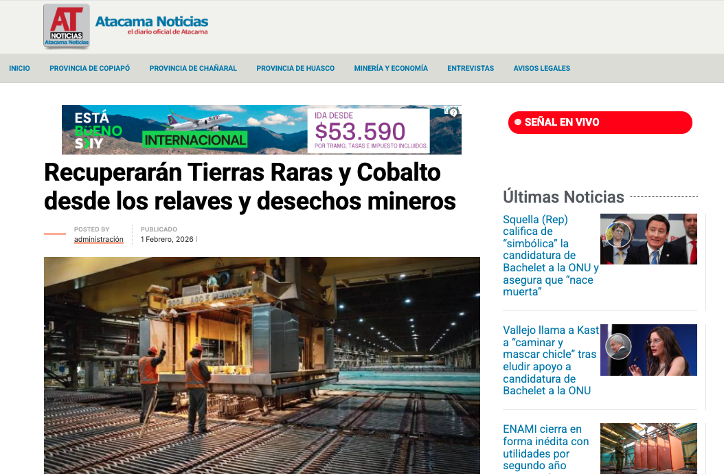 Atacama Noticias Recuperarán Tierras Raras y Cobalto desde los relaves y desechos mineros Leer más » 01/02/2026