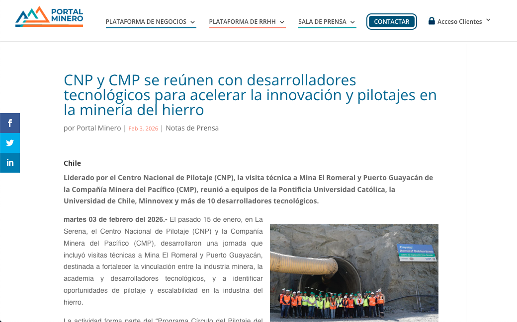 Portal Minero CNP y CMP se reúnen con desarrolladores tecnológicos para acelerar la innovación y pilotajes en la minería del hierro Leer más » 03/02/2026