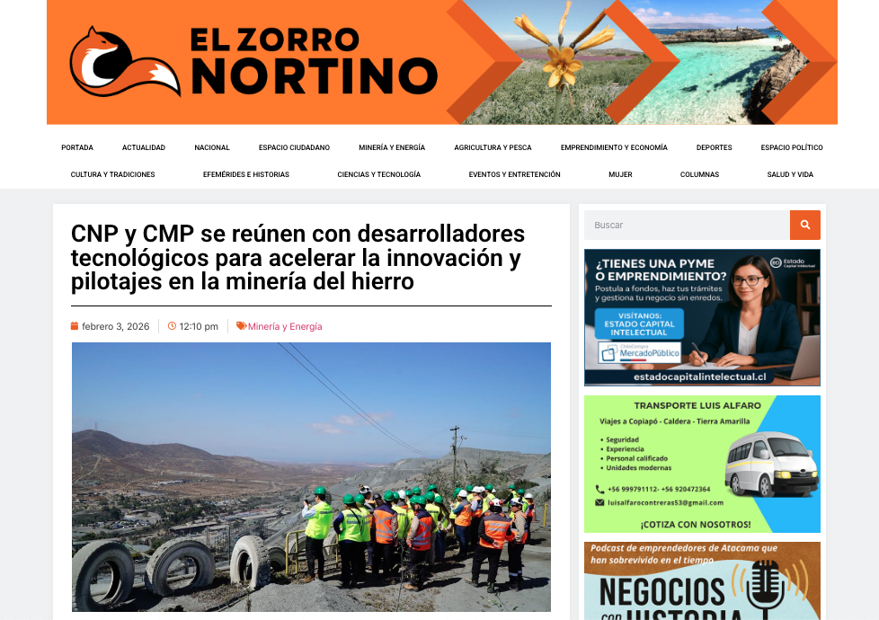 El Zorro Nortino CNP y CMP se reúnen con desarrolladores tecnológicos para acelerar la innovación y pilotajes en la minería del hierro Leer más » 03/02/2026