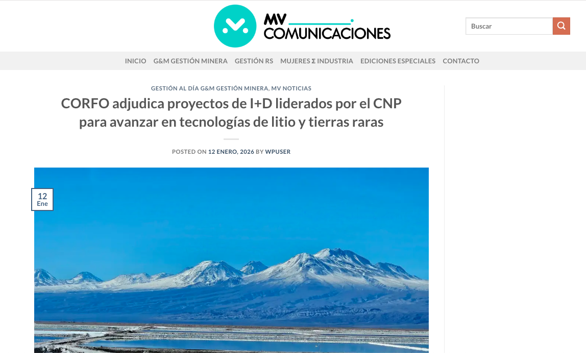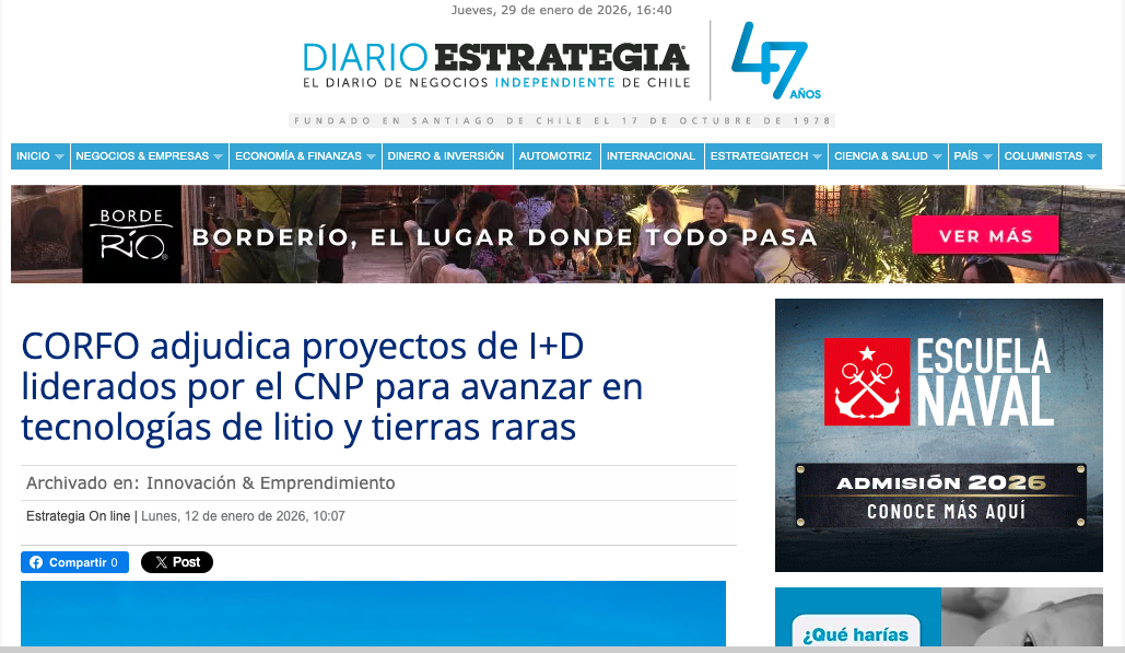 Diario Estrategia CORFO adjudica proyectos de I+D liderados por el CNP para avanzar en tecnologías de litio y tierras raras Leer más » 12/01/2026