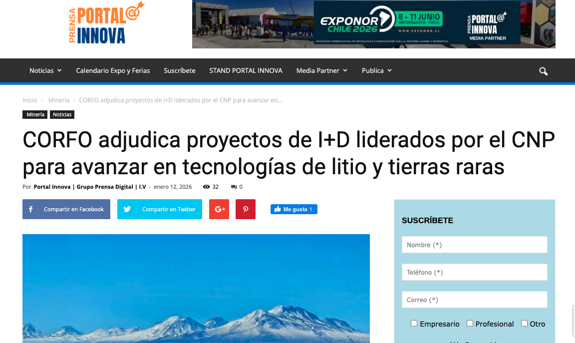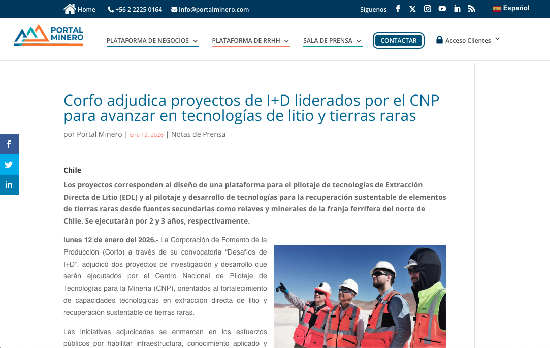 Portal Innova CORFO adjudica proyectos de I+D liderados por el CNP para avanzar en tecnologías de litio y tierras raras Leer más » 12/01/2026
