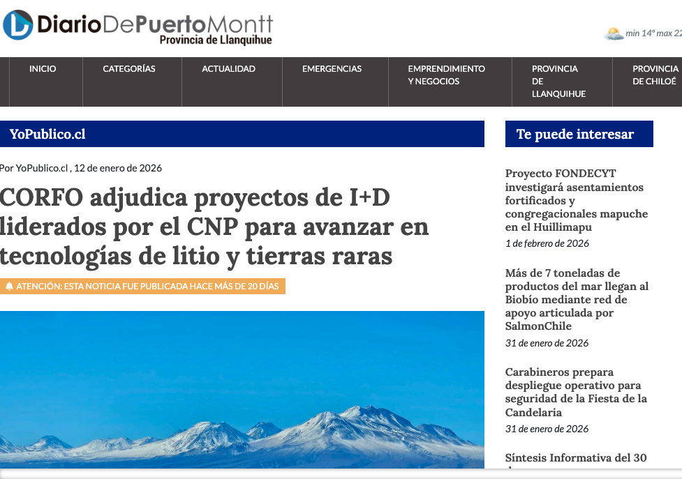 Diario de Puerto Montt CORFO adjudica proyectos de I+D liderados por el CNP para avanzar en tecnologías de litio y tierras raras Leer más » 12/01/2026