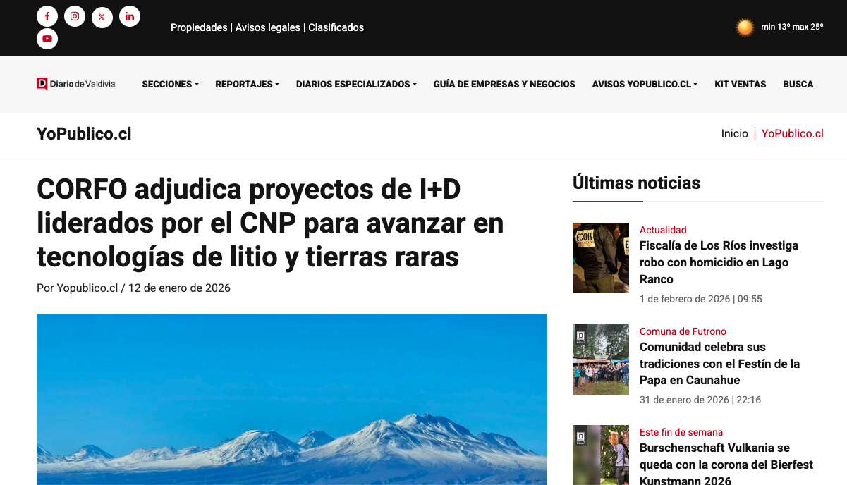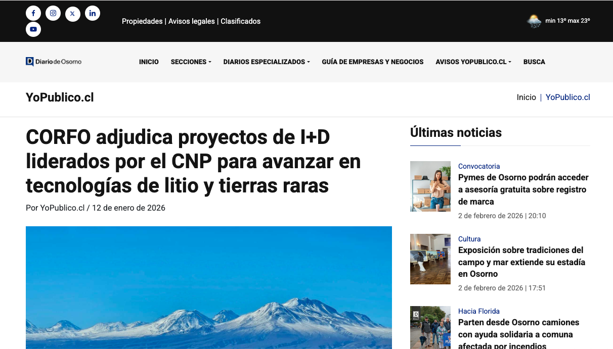 Diario de Osorno CORFO adjudica proyectos de I+D liderados por el CNP para avanzar en tecnologías de litio y tierras raras Leer más » 12/01/2026