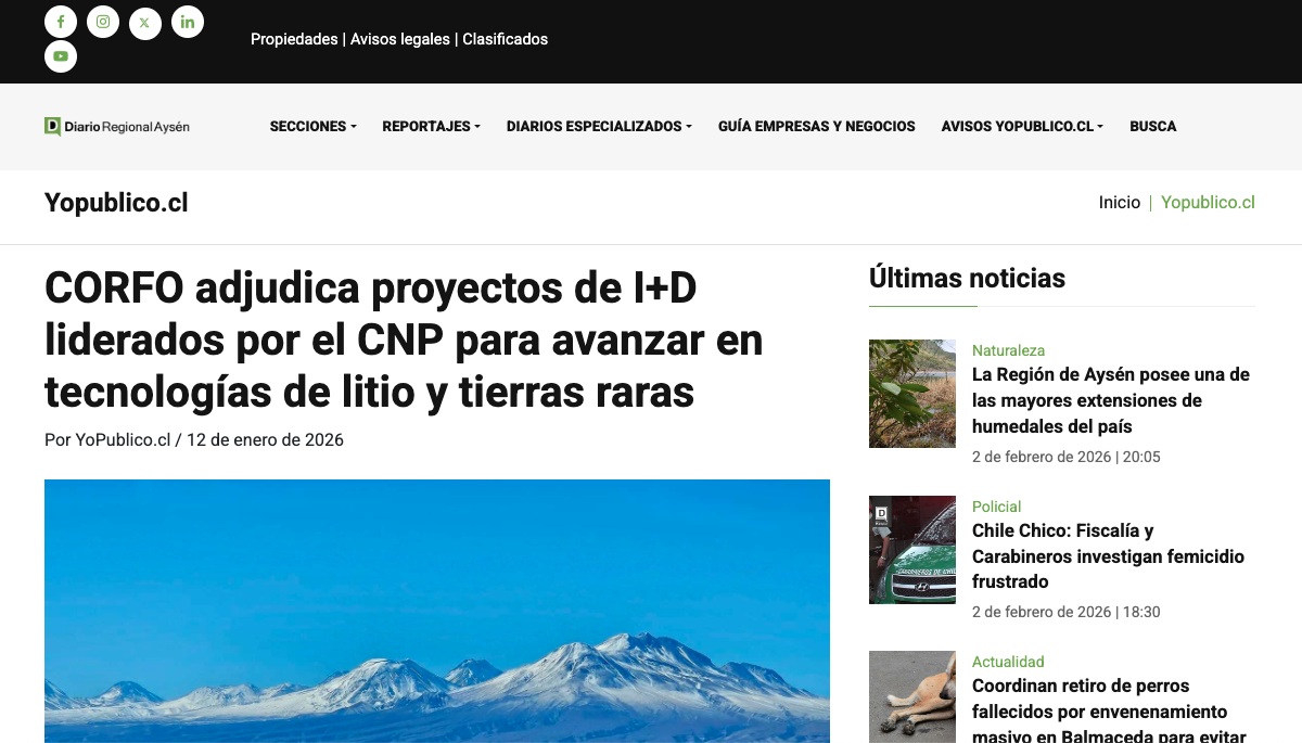 Diario Regional Aysén CORFO adjudica proyectos de I+D liderados por el CNP para avanzar en tecnologías de litio y tierras raras Leer más » 12/01/2026